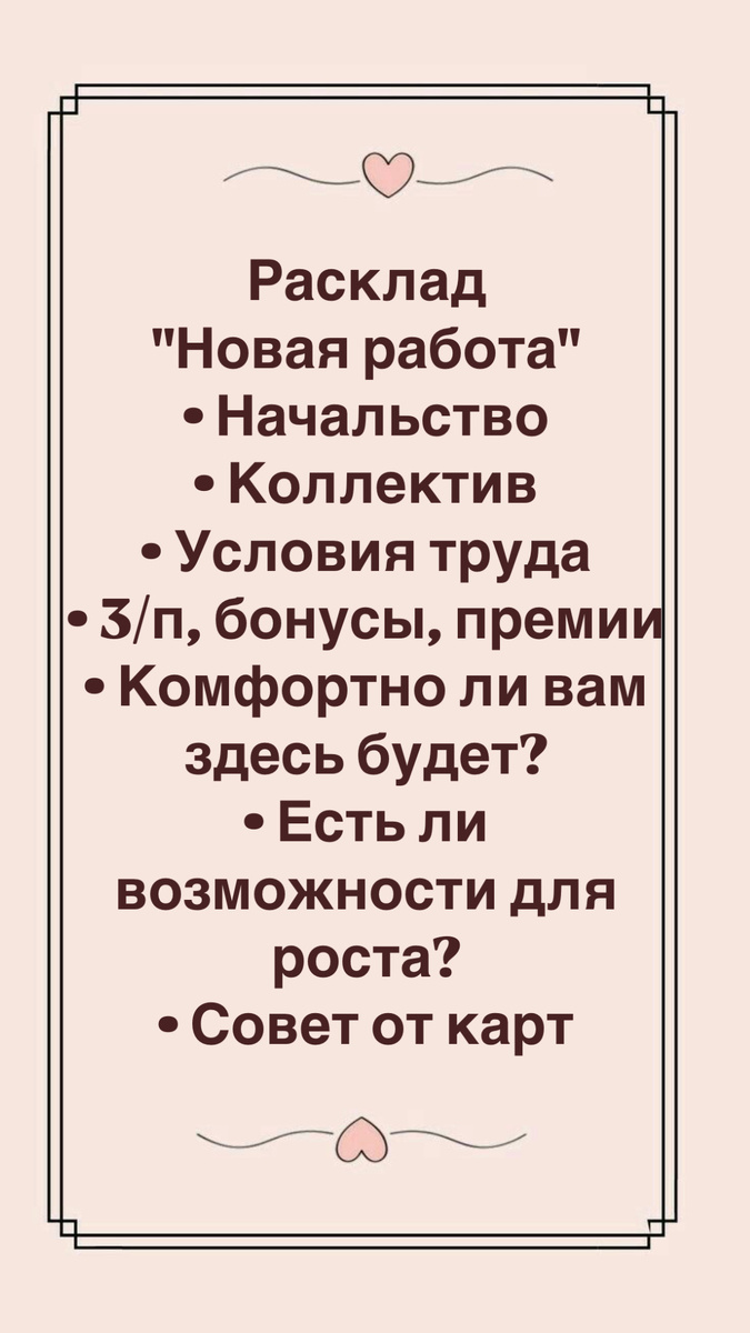 Расклад «Новая работа»: ключ к успешному трудоустройству Когда мы ищем новую работу, одним из главных вопросов становится: «Комфортно ли мне будет здесь работать?» Ведь от этого зависит наше настроение, продуктивность и даже здоровье. Именно для того, чтобы ответить на этот вопрос, существует расклад «Новая работа». После проведения расклада вы получите полную картину о новой работе и сможете принять взвешенное решение о трудоустройстве. Не забывайте, что каждый человек уникален, и то, что подходит одному, может быть совершенно неприемлемо для другого. Поэтому всегда прислушивайтесь к себе и своим ощущениям.