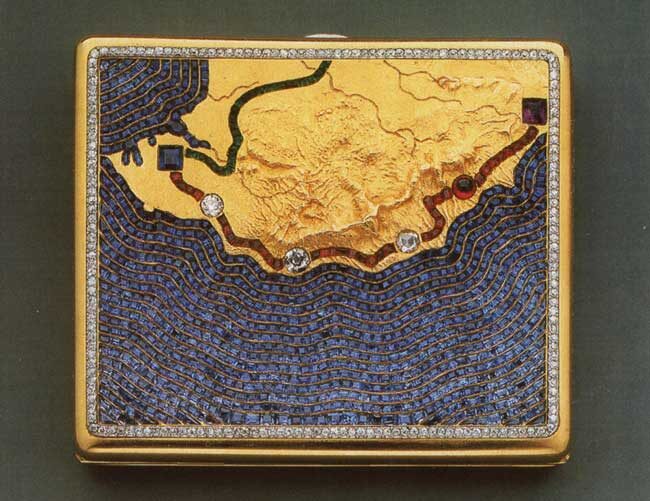 Горы на портсигаре изображены золотом, Чёрное море - сапфирами, потребовалось около 2 тысяч штук, маршрут от Севастополя до Симферополя - изумрудами, а от Севастополя до Алушты - рубинами, а станции... первые буквы названия драгоценных камней совпадают с названием станций: