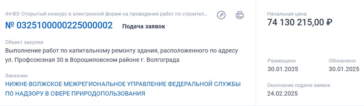 Как сообщает «Блокнот Волгоград», начальная цена контракта составила 74 130 215 рублей. Как следует из конкурсной документации, все работы на объекте должны быть завершены до 1 декабря текущего года. Заказчиком работ выступает Нижне-Волжское межрегиональное управление федеральной службы по надзору в сфере природопользования. Также в здании, где предстоит капремонт, занимают помещения Департамент по недропользованию по Южному федеральному округу, Центр лабораторного анализа и технических измерений (ЦЛАТИ) по Волгоградской области, Нижне-Волжское бассейновое водное управление и другие организации, призванные обеспечивать надзор за соблюдением природоохранного законодательства и норм.