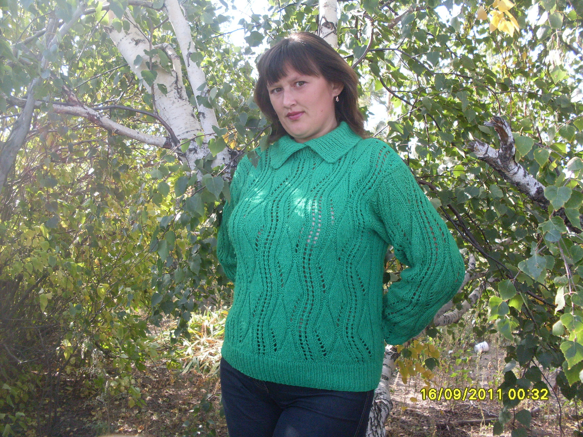 ВЯЖЕМ АЖУРНЫЕЙ ПУЛОВЕР "ИЗУМРУД" Предлагаю любителям вязания ажурных узоров связать красивый пуловер. " ИЗУМРУД" РАЗМЕР 48-50, ПОТРЕБУЕТСЯ 500 г ярко-зеленой пряжи(полушерсть,100 г/250 м),спицы № 2,5 и № 3,5, РЕЗИНКА 1Х1: 1 лиц ,1 изн, ОСНОВНОЙ УЗОР : по схеме, Или по видео мастер-классу тут СПИНКА: Набрать на спицы № 2,5 104 п и вяжите резинкой 10 см (20 рядов) ,Далее вяжите спицами № 3,5 ажурным узором, распределив петли так:кром,3 лиц, 5 раппортов узора,4 лиц,кром, на высоте 35 см для ПРОЙМ закройте с обеих сторон полотна 1 раз по 8 петель, для ГОРЛОВИНЫ на высоте 61 см от резинки закрыть средние 26 п,для закругления с внутренней стороны закрыть в каждом 2-м ряду 1 раз по 4 п,1 раз по 2 п ,На высоте 63 см закрыть оставшиеся п плеча, ПЕРЕД :аналогичен спинке,но для ВЫРЕЗА ГОРЛОВИНЫ на высоте 58 см от резинки закрыть средние 16 п ,далее по обе стороны закончить раздельно, для закругления с внутренней стороны закрыть в каждом 2 -м ряду 1 раз по 4 п ,1 раз по 3 п 1 раз по 2 п