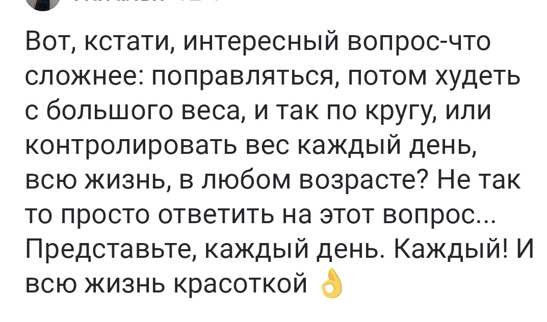 Здравствуйте, мои дорогие друзья и гости канала. Для тех, кто впервые заглянул на огонек, расскажу о себе: Меня зовут Светлана, мне 42 года. На своем канале я рассказываю о жизни, поездках, покупках, делюсь рецептами и бесконечно пытаюсь похудеть. Сбросила 30 кг с 2022 года, начальный вес 94,5кг., теперь надо удержать достигнутое. Сегодня увидела комментарий и мне стало любопытно, что ответите вы, мои дорогие читатели, на поставленный вопрос. Я, если честно, думала очень долго. И мне всё же кажется, что легче держать вес всю жизнь. Обосную. Когда ты следишь за фигурой и видишь небольшую прибавку веса, то сразу же включается сигнал 🆘. Ты начинаешь просто немного ограничивать себя. За годы жизни привыкаешь к определённому питанию. Уже знаешь, когда можно позволить себе лишнее в еде, а когда стоит затянуть поясок. Другое дело, когда ты уже познал все прелести обжорства, ни в чём себе не отказывал. И вдруг тебе необходимо полностью пересмотреть питание, ограничивать себя в привычном,