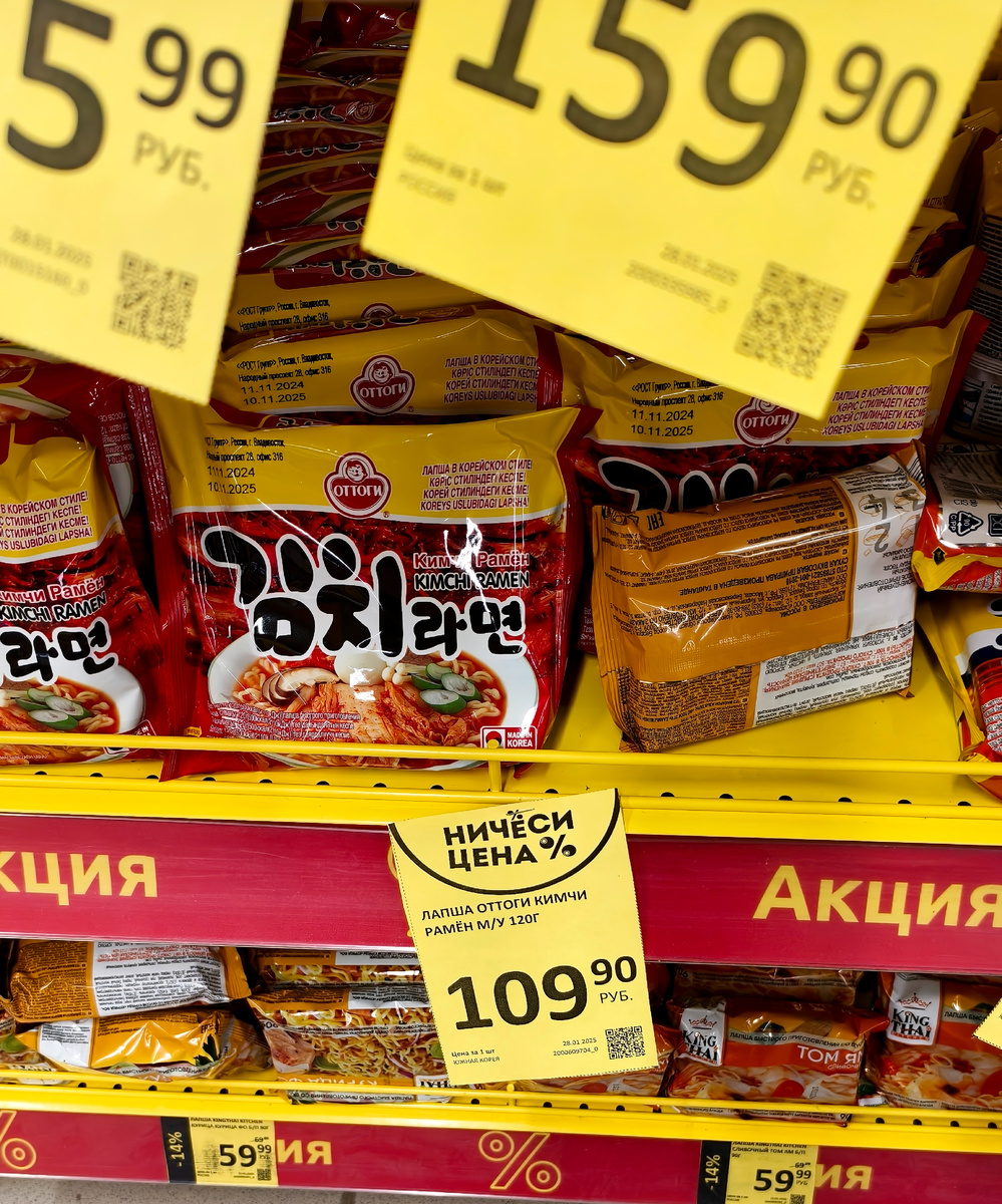 Всем привет! В Дикси привезли ещё два вида лапши Оттоги в мягких пачках по 109.9 рублей. Я взял на пробу кимчи рамён, вторая была такая же как я пробовал до этого. Но в мягкой пачке, а не в стакане. Думаю такую выгоднее брать. Стоит дешевле, а по массе почти в 2 раза больше. Большой пакет массой 120 граммов. В составе очень много добавок. Мне кажется если отсюда что-нибудь убрать ничего особо не изменится. Например трифосфат пенатрия или динатрий гуанилат. Или ещё что-нибудь Хотел я быстренько заварить лапшу, но не тут то было. Эта лапша для варки. Сейчас я стараюсь готовить по рецептам на упаковке, поэтому буду готовить так как написано. Варить так варить. В комплекте только лапша и специи. Залил пол литра воды и довел до кипения. Засыпал специи и лапшу. Не совсем по рецепту получилось, но ничего страшного. Далее надо варить ровно 4 минуты. Получается такой ядерный бульон. От него веет остротой на расстоянии. На деле бульон оказался не таким страшно острым как я думал.