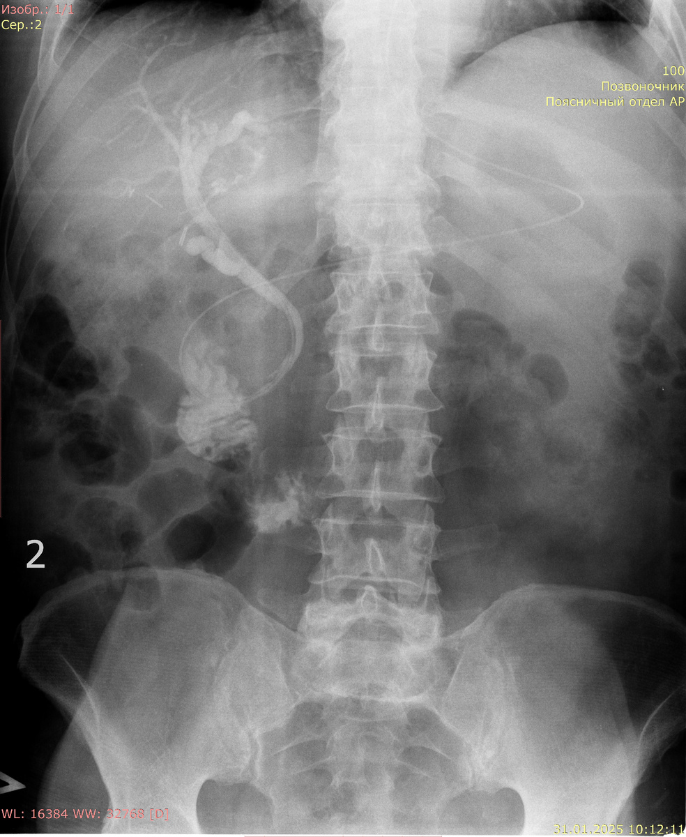 НБД (назобилиарное дренирование) — это медицинская процедура, которая используется для обеспечения оттока желчи и других жидкостей из печени или желчного пузыря. Обычно она применяется в случаях, когда естественный отток затруднён по причинам, таким как желчнокаменная болезнь, опухоли, воспалительные процессы или после хирургических вмешательств. Контрастом выполнились внутри- и внепеченочные протоки. Диаметр холедоха около 6 мм, дефектов не обнаружено. Тени металлических клипс в проекции пузырного протока. Контраст поступает в ДПК.