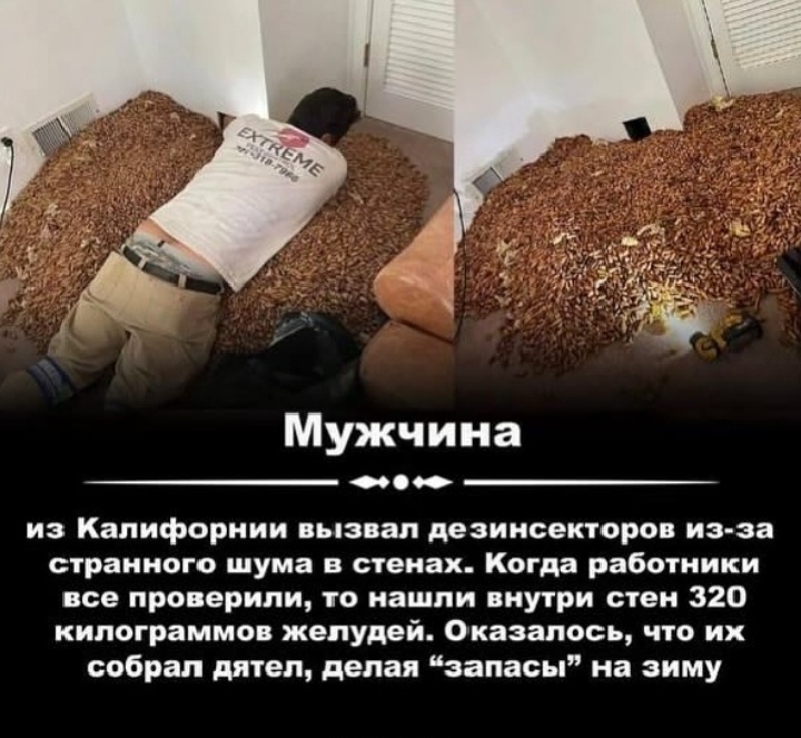 В жизни бывают моменты, когда реальность оказывается страннее любого вымысла. Именно это произошло с жителем Калифорнии, который обратился за помощью к инспекторам из-за странного шума в стене своего дома. То, что они обнаружили, стало настоящей сенсацией и заставило всех задуматься о том, насколько природа может быть изобретательной. Всё началось с того, что мужчина стал замечать непонятные звуки, доносящиеся из стены его дома. Это был не просто скрежет или шум ветра — звуки напоминали что-то живое, словно внутри стены кто-то копошился. Сначала он пытался игнорировать это, но со временем шум стал настолько громким, что жить в доме стало невозможно. Мужчина вызвал инспекторов, чтобы те разобрались в ситуации. Когда специалисты вскрыли стену, их ждал настоящий шок. Внутри они обнаружили огромное количество желудей — более 320 кг! Это было настолько невероятно, что сначала никто не мог поверить своим глазам. Оказалось, что за этим "складом" стоял дятел, который годами использо