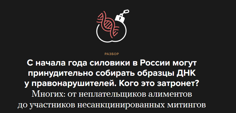 Мы не знаем. Теперь силовики формально смогут проводить геномную регистрацию всех людей, кого суд признал правонарушителями — и отправил под административный арест. Однако если посмотреть на официальные данные, то даже в случае с подозреваемыми и обвиняемыми в совершении преступлений (напомним, информацию их ДНК силовики могут собирать с мая 2023 года), на геномный учет ставят далеко не всех. Прошлой осенью ЭКЦ ГУ МВД России по Московской области сообщила, что с января по сентябрь 2024 года учет в федеральную базу данных геномной информации поставили 1340 осужденных и 8270 подозреваемых или обвиняемых в совершении преступлений. По данным подмосковной прокуратуры, за тот же период было выявлено 27 048 человек, совершивших преступления. 7 Никак, на то она и «обязательная». То есть принудительная. «Медуза» нашла несколько случаев, когда людей штрафовали за отказ предоставлять образцы ДНК для принудительной государственной геномной регистрации. Не помогла даже ссылка на религиозные убежден