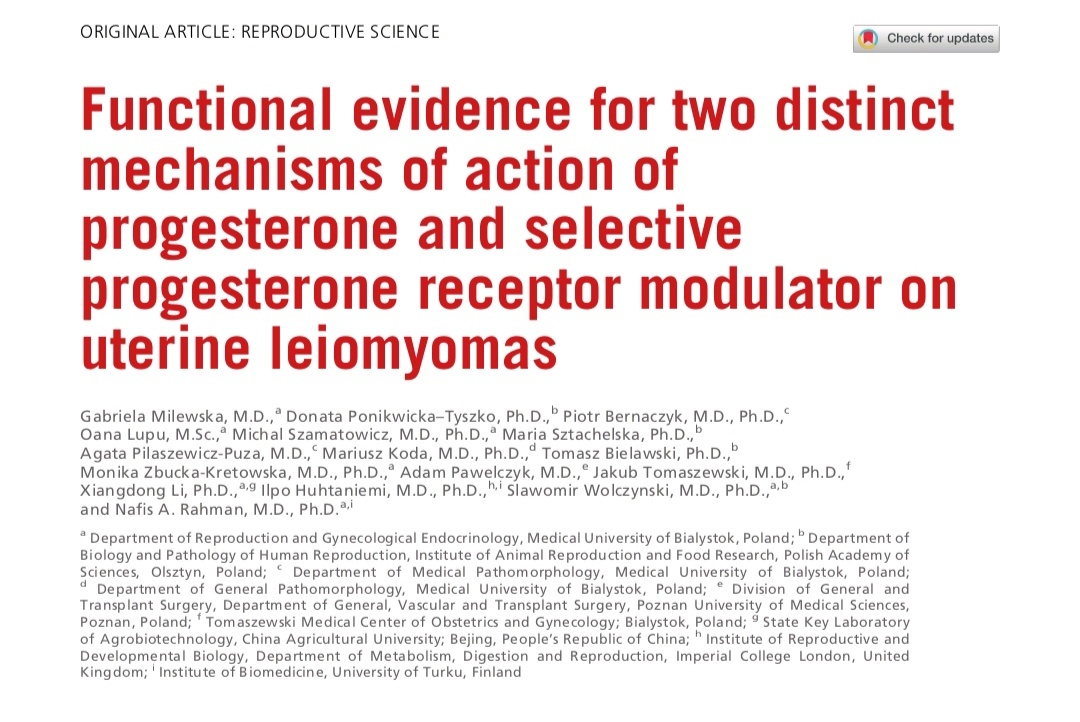 Данные представлены в:Milewska G, Ponikwicka-Tyszko D, Bernaczyk P, Lupu O, Szamatowicz M, Sztachelska M, Pilaszewicz-Puza A, Koda M, Bielawski T, Zbucka-Kretowska M, Pawelczyk A, Tomaszewski J, Li X, Huhtaniemi I, Wolczynski S, Rahman NA. Functional evidence for two distinct mechanisms of action of progesterone and selective progesterone receptor modulator on uterine leiomyomas. Fertil Steril. 2024 Aug;122(2):341-351. doi: 10.1016/j.fertnstert.2024.02.046. Epub 2024 Feb 29. PMID: 38431184.