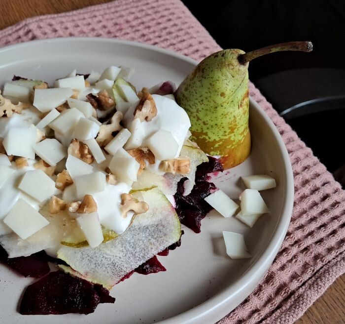 Опять я накануне позволила себе лишнего, и, здравствуй, салатик вместо обеда! Свекла вареная, груша системы "Конференция", сыр козий, дорогой зараза, "Качотта", орехи грецкие, йогурт греческий - все в наличии. База понятна, детали - по возможностям. Сорт груши и сыра не принципиален, орехи любые подойдут, йогурт можно заменить на сметану. Технология элементарна: