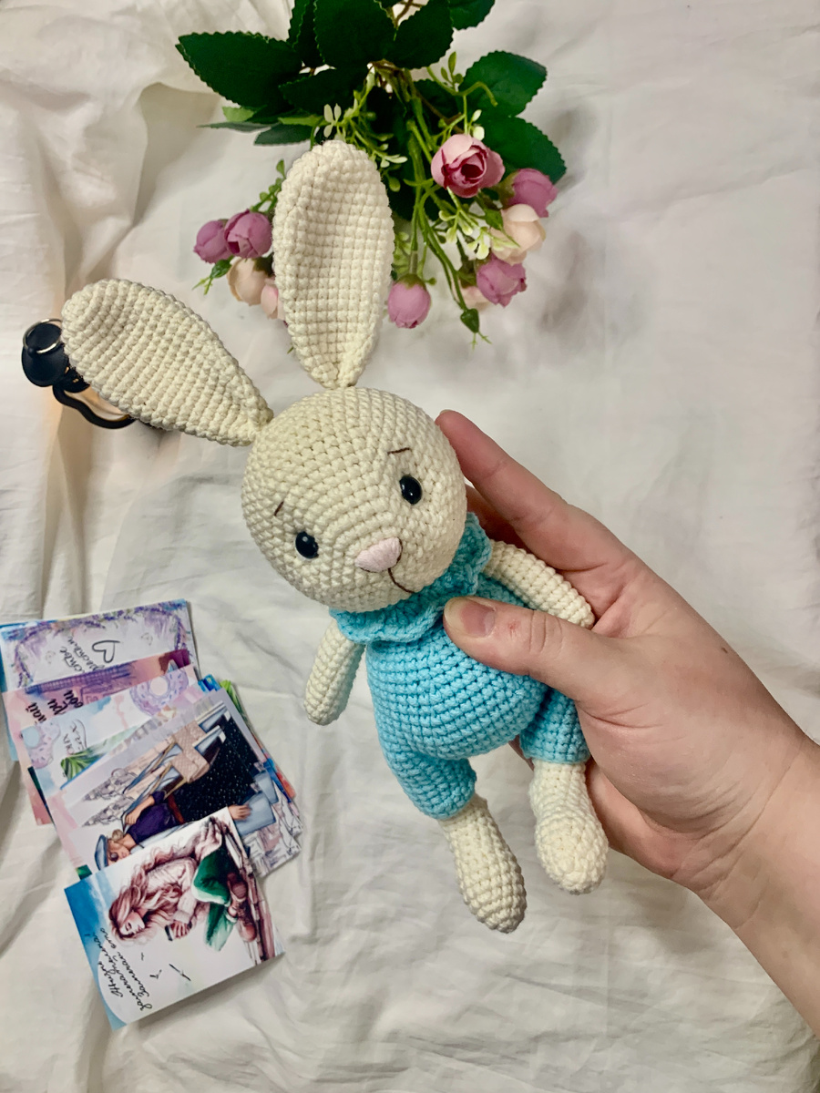 Первый мк, который приглянулся мне, стал "Хлопковый зайка крючком" от автора Mаrina-ΡеnsеВonheur. Это бесплатный мастер-класс, предоставленный сайтом irinely.art. По ходу вязания мне не нравились пропорции, ошибки в оформлении, НО! Эти лапки, которые покорили мое сердце. Связав их я совсем забыла о трудностях. В итоге у меня получился прелестный зайка, который по своему размеру подойдет для бейби бокса малышу. Зайка связан из пряжи картопу амигуруми (цвет