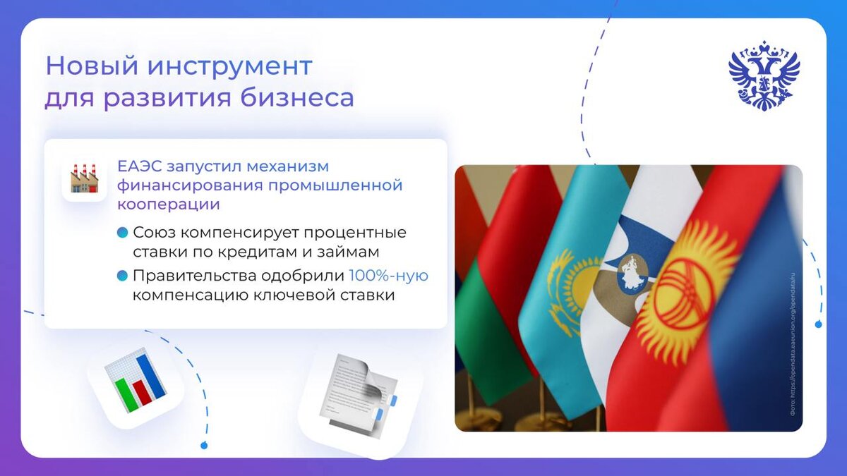 Евразийский экономический союз продолжает создавать возможности для промышленного развития. Совет ЕЭК одобрил первые заявки на субсидирование 2 проектов в рамках нового механизма финансирования промышленной кооперации. Почему это важно? Разбираемся. Что такое механизм финансирования промкооперации Инструмент поддержки производителей стран ЕАЭС позволяет компенсировать из бюджета Союза процентные ставки по кредитам и займам, взятым на реализацию совместных проектов. Что нового в работе механизма Главы правительств государств ЕАЭС одобрили уникальную поддержку: 100%-ную компенсацию ключевой ставки центрального (национального) банка страны-участницы. Какие заявки уже приняли Муромский стрелочный завод создаёт мощности для выпуска стрелочной продукции для высокоскоростных магистралей, включая строительство ВСЖМ-1 Москва — Санкт-Петербург. Проект обеспечит важную инфраструктуру для развития скоростных перевозок. Kazrost Engineering Ltd. расширяет производство сельхозтехники. Средства пойдут