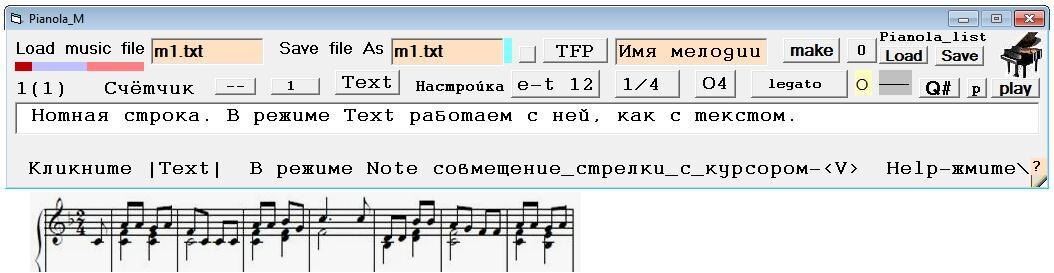 Пианола_М рассчитана на 50 нотных строк, и исполнение такого количества нотных строк длится 6 – 7.5 минут. Номер текущей нотной строки показывается в окне слева, а в скобках следом указывается общее число задействованных в программе нотных строк. В начале работы там указано 1(1).