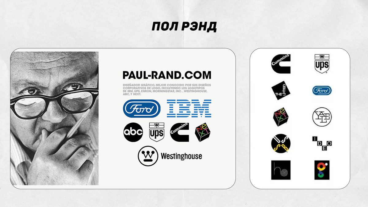 Пол Рэнд — один из самых известных графических дизайнеров XX века. Он создал логотипы для таких крупных компаний, как IBM, UPS и ABC. Его работы отличаются простотой и элегантностью, что делает их легко узнаваемыми и запоминающимися. Рэнд был пионером в использовании минимализма и геометрических форм, что стало основой для многих современных дизайнерских решений. Соль Бас — легендарный дизайнер, известный своими кинематографическими титрами и постерами. Он работал с такими режиссерами, как Альфред Хичкок и Мартин Скорсезе. Стиль Баса характеризуется минимализмом и использованием геометрических форм. Его работы, такие как титры к фильмам «Психо» и «Вертиго», стали классикой и продолжают вдохновлять дизайнеров и кинематографистов. Милтон Глейзер — автор знаменитого логотипа «I ❤️ NY». Его работы отличаются яркими цветами и выразительными шрифтами. Глейзер также соучредитель журнала New York Magazine. Он внес значительный вклад в развитие графического дизайна, создавая визуально привлек