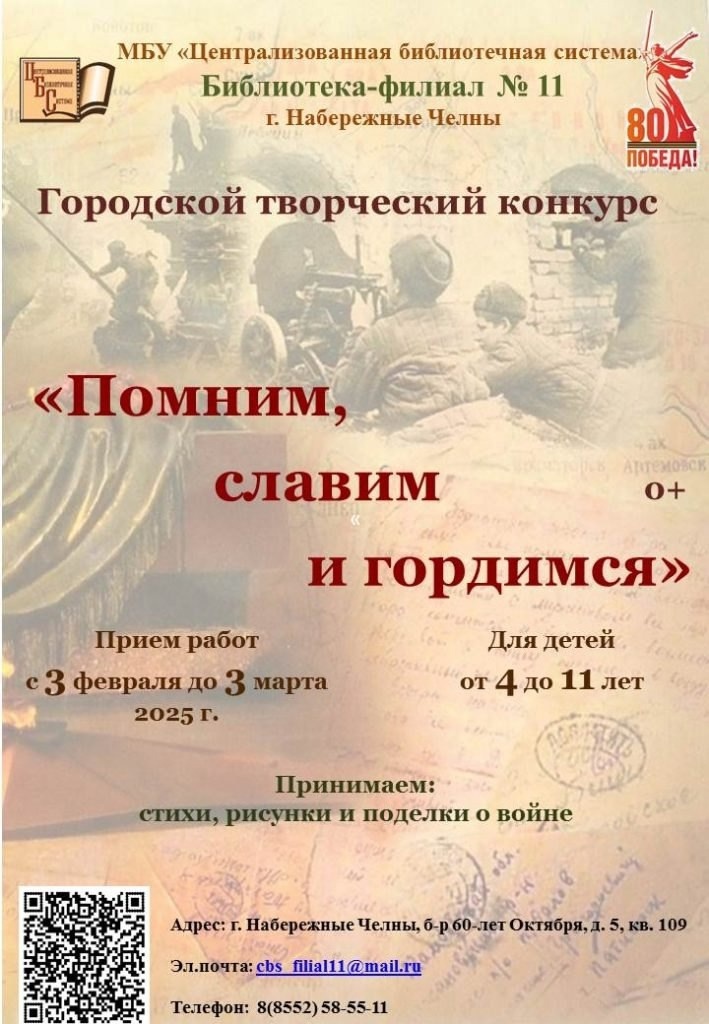 Положение конкурса на нашем сайте: https://библиотека-челны.рф/konkursy-i-akcii/regionalnye-gorodskie-konkursy-i-akczii/gorodskoj-tvorcheskij-konkurs-pomnim-slavim-i-gordimsya-0