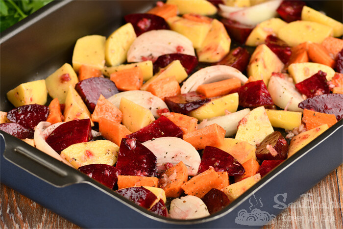 Свёклу, как и все овощи, нарезаем на ломтики, добавляем соль, остатки соуса, перемешиваем и перекладываем к другим овощам. Свёклу перемешиваем отдельно, чтобы она не окрасила другие овощи. Запекаем в разогретой духовке при 200 градусах 25 минут (чеснок, который был в соусе не успеет подгореть). Форму фольгой не закрываем.