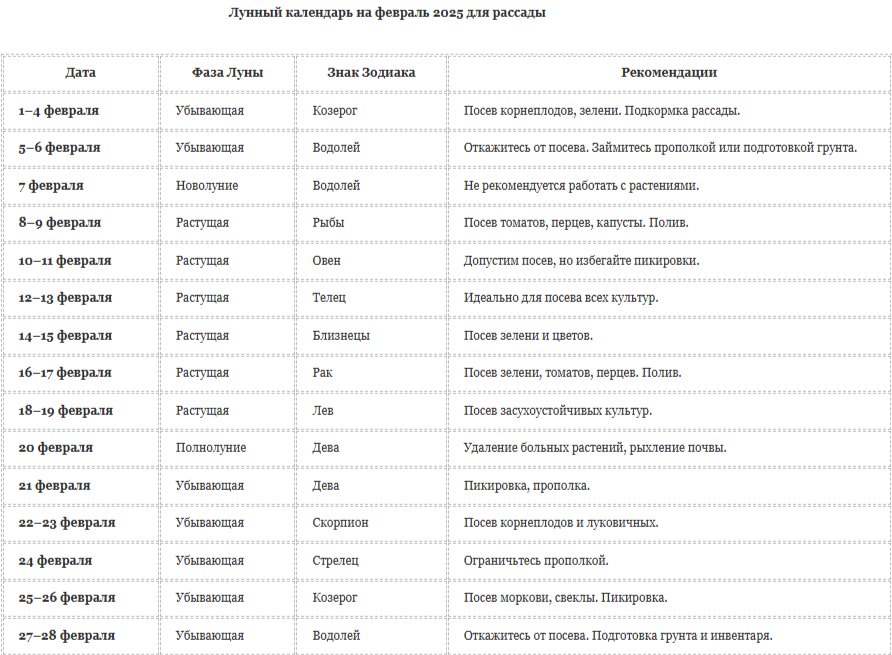 Февраль — ключевой месяц для подготовки рассады, особенно для культур с длинным вегетационным периодом. Лунный календарь помогает определить оптимальные дни для посева, учитывая влияние фаз Луны и зодиакальных созвездий. Разберемся, как спланировать работы в феврале 2025 года. Мы составили его без учета привязки к региону Сибирь, ДВ или Урал.