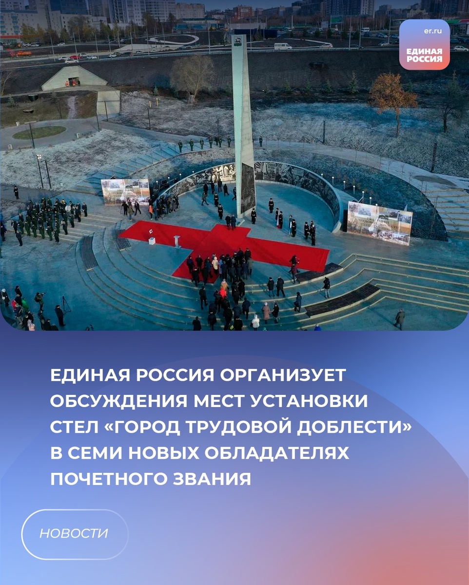 «15 января Президент поддержал предложение Единой России о присвоении почетного звания «Город трудовой доблести» семи городам. Это – Курган, Верхняя Пышма, Ишимбай, Миасс, Зеленодольск, Ленинск-Кузнецкий, Салехард. Таким образом, сейчас у нас 70 городов, которым присвоено это высокое звание. В ближайшее время вместе с жителями городов определим места размещения памятных стел», — рассказал секретарь Генсовета Единой России Владимир Якушев.