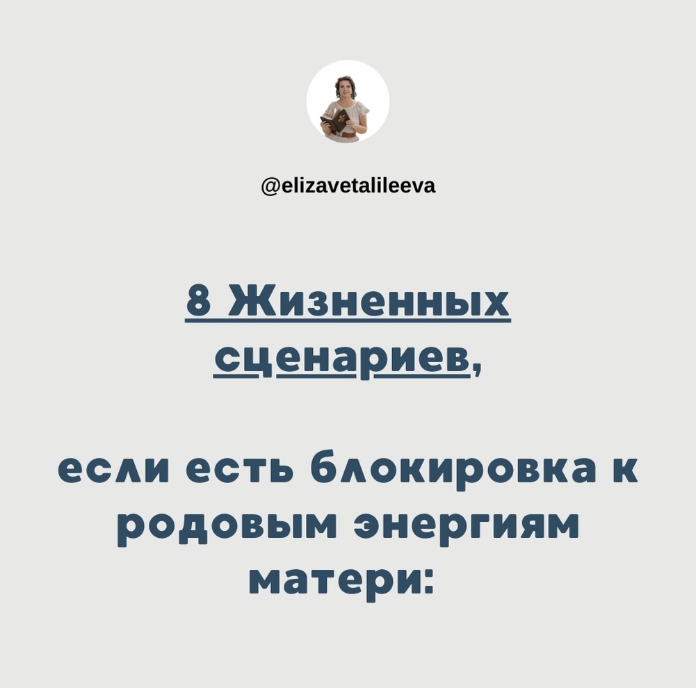 8 Жизненных сценариев, если есть блокировка к родовым энергиям матери: 1️⃣ Уничижение себя, обесценивание, ощущение что не достойна ничего: любви, внимания, заботы, материального. - Плохо с материальным, нет дома, квартиры, своего личного пространство в доме. Жизнь как у приживалки. - Сложно тратить деньги на себя, сложно просить о подарках или о помощи. Сложно заботиться о себе, о своем здоровье. - Внутри ощущение, что всем что-то должна, просто так любить не за что. 2️⃣ Жизнь в ощущением тотального чувства вины за все. Виновата перед мужем, не достаточно «хорошая жена», перед детьми - не достаточно «хорошая мама», перед родителями, перед коллегами. - Женщина проваливается в ощущение чувства вины как в темную, глубокую ,вязкую нору и пытается оттуда выбраться. - Чувство «ты плохая мать» накрывает ее, при том, что дети окружены чрезмерной заботой и любовью. 3️⃣ Желание все в жизни контролировать: действия мужа, детей, родителей. Обязательно контролировать свои чувства, поэто