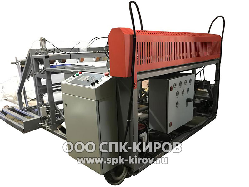 Нож – сталь с встроенным трубчатым нагревателем 2 кВт. Подача ткани в зону резания автоматическая с помощью сервопривода 1 кВт, с размоточного устройства. Размоточное устройство имеет накопитель ткани и устройство для подъема рулонов с ПП-тканью.
