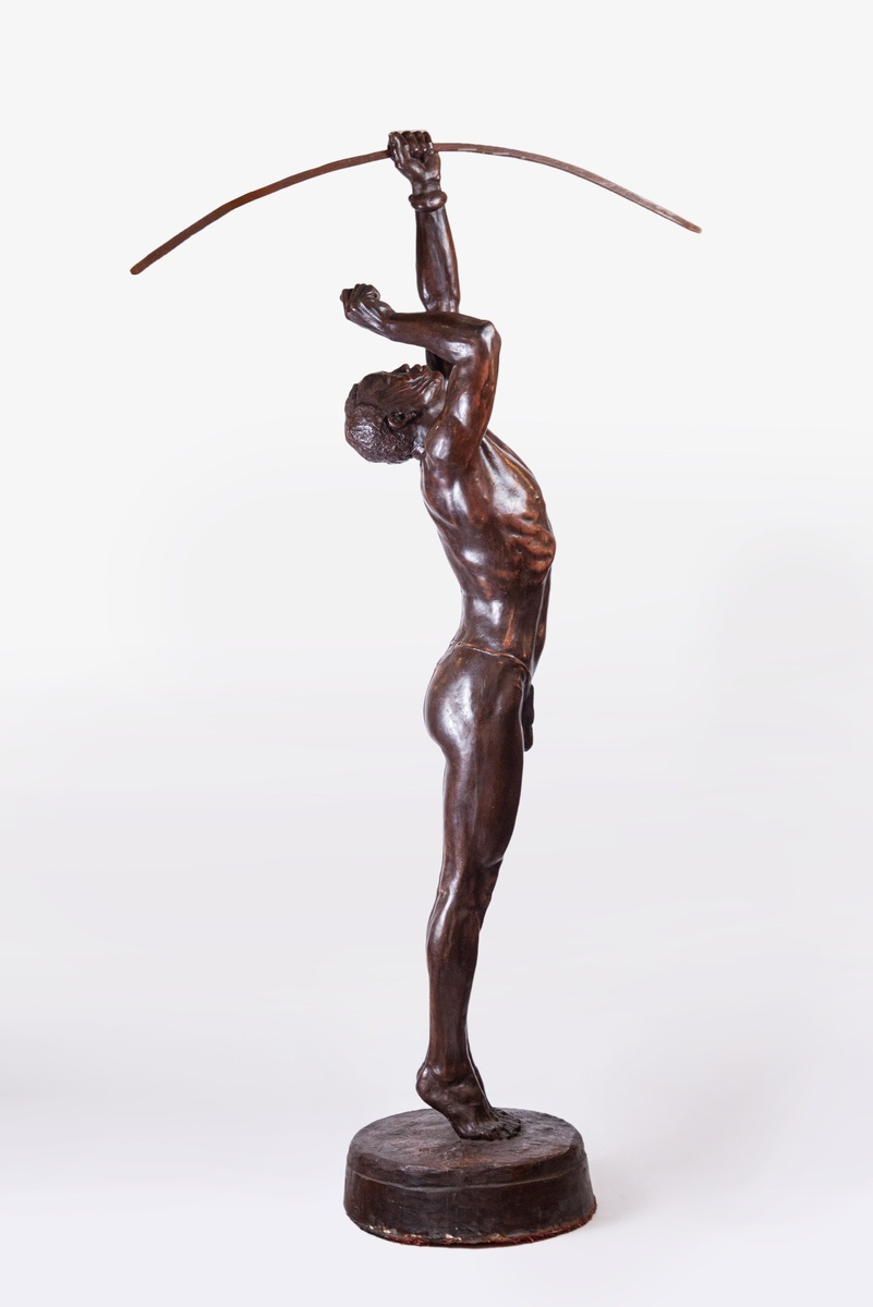 Терракотовая скульптура, выполненная по модели французского скульптора Жана-Мари Камю (1877–1955). Композиция изображает охотника из Верхней Вольты (ныне Буркина-Фасо) в динамичной грациозной позе: он вытянулся вверх, напряжённо прицеливаясь из лука ввысь и стремясь поразить свою цель. Каждая деталь фигуры — от внимательно проработанной мускулатуры до изгиба лука — передаёт силу, грацию и сосредоточённость охотника. Скульптура исполнена в натуральную величину, что усиливает ощущение присутствия и позволяет зрителю воспринимать её как живой образ. Особое внимание привлекают традиционные шрамы на теле и лице лучника, характерные для многих этнических групп региона: они подчёркивают культурную идентичность данного героя. Эта работа представляет собой гармоничное сочетание этнографической точности и изящества европейской академической скульптурной традиции. Основание отмечено круглой маркой мастерской Деларю Пикард, зарегистрированной в Париже в 1885 году. Жан-Мари Камю — французский скуль