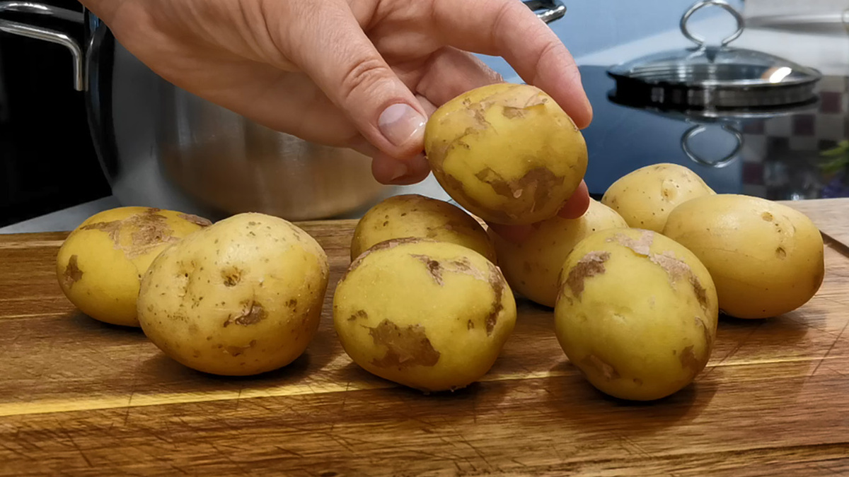 На фото у меня картошка молодая, поэтому я ее хорошенько поскребла, чтобы дальше готовить со шкуркой. Именно в этом очень классная фишка. Но сейчас молодой картошки еще нет. Поэтому как сварится, если кому-то не нравится такая идея, то можно и почистить. Хотя я даже с зимней картошки шкурку все равно не снимаю. Есть в неснятой шкурке своя прелесть. Кто любит, тот поймет.