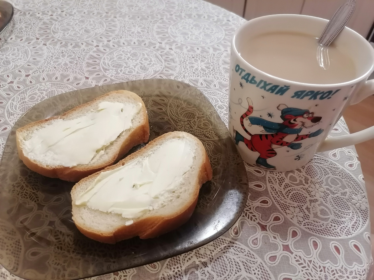 Поэтому утром проснулась около 10 часов. Умылась, позавтракала. Завтрак был самый простой. Чай с молоком и батон с маслом.