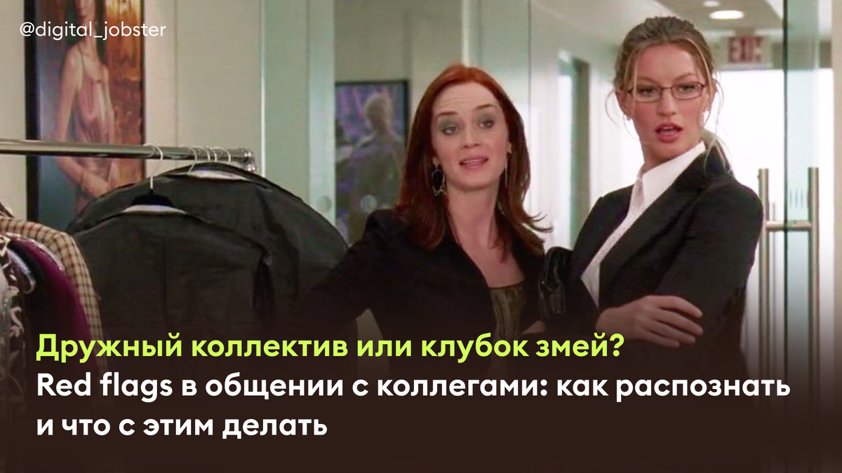 Современные команды в диджитал-сфере — это смесь креатива, дедлайнов и мемов в рабочих чатах. Кажется, все идеально, но иногда взаимодействие с коллегами напоминает токсичный триллер Netflix. Вы наверняка видели мини-версии Миранды Пристли из «Дьявол носит Prada». Да-да, это те самые коллеги, которые могут в понедельник утром сообщить о подготовке к завтрашней презентации, бросить холодный взгляд вместо фидбэка и на ходу сказать: «Я ожидал(а) большего» 🥲🥲🥲 Деспотичное отношение, недоверие, пассивная агрессия — всё это примеры того, как рабочие отношения могут превратиться в эмоциональные качели. Очень важно вовремя распознать негативные сигналы, чтобы не оказаться в роли Энди, изо всех сил пытающейся доказать свою ценность в токсичной атмосфере. Red flags — это тревожные звоночки, которые указывают на проблемы в рабочем взаимодействии. В диджитал-компаниях с их быстрым ритмом и высокой вовлечённостью такие маркеры отравляют атмосферу, стопорят коммуникацию, срывают проекты и привод