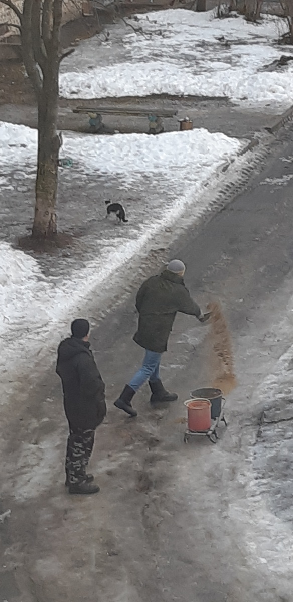 Сегодня утром, наконец-то красная армия пришла на помощь в лице дворника с совком. Он отчаянно боролся с гололёдом, разбрасывая песок на спины любопытствующих котов, облегчая заодно и труд травматологов с хирургами. Думаю, они шлют ему лучи добра и поддержки.Травматологи и хирурги, не коты. Естественно, тут же нашлись смотрящие контролёры. У мужиков всегда так - один работает, трое рядом стоят.Наблюдают и дают советы. -"После вкусного обеда по закону Архимеда...."- громко запел муж, усевшись за стол рядом с Китей. -"Вытрем руки об соседа!"- продолжила я с готовностью фразу. Мы с мужем относимся к тому поколению, которое воспитывалось на одних песнях, стихах, рассказах и прочем. Если я спрошу у мужа, идущего мне навстречу по дороге с путающимся под ногами липучкой Китей: " Кто шагает дружно в ряд?" Мне в ответ тут же выпалят: "Это смена комсомола, юных ленинцев отряд! Раз в ногу, в ногу раз! Нас много- много нас! Сильные, умелые, всегда мы тут как тут!" И Китя в конце издаст