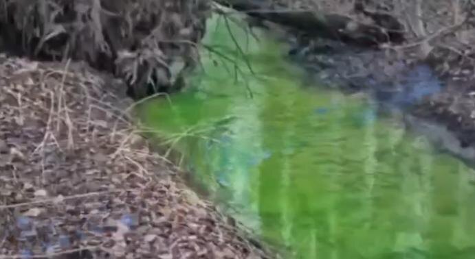 Ручей в Новомедвенском окрасился в ярко-зеленый цвет
