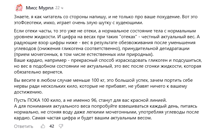 По-хорошему все верно и логично. Мне надо замереть и просто удерживать свой вес в этой точке. Я бы это пыталась донести до любого человека, сумевшего отпрыгнуть от края пропасти морбидного ожирения. Я так искренне считаю. У меня есть повод так думать. Это диктует здравый смысл.