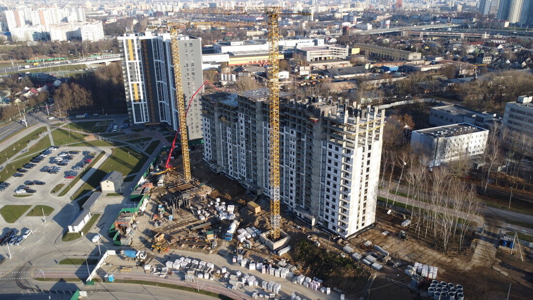 В районе улицы Железнодорожной в Минске растет третья многоэтажка нового жилого комплекса «Дубравинский». Осваивает этот участок застройщик «БелБизнесРесурс». Первые два дома ЖК сдали в эксплуатацию еще в 2023-м году, а сейчас тут строят еще одну высотку на 493 квартиры. Сегодня в газете «Минский курьер» были опубликованы изменения в предыдущую декларацию застройщика. Выросли цены на евротрешки и еврочетырешки. МинскЯндекс Карты — транспорт, навигация, поиск мест В строящемся монолитном доме (по генплану − № 5) будет 21 этаж, 3 подъезда и сразу 493 квартиры. Возводить многоэтажку начали в апреле прошлого года, а сейчас строители работают на уровне 16-го этажа. Процент строительной готовности третьего дома на начало января составлял 50%. Закончить третью многоэтажку по документам должны во втором квартале 2026 года, но возможно это произойдет и раньше (такая практика у застройщика есть). Продажи в третьем доме стартовали прошлым летом. Изначально цены начинались от 1250 долларов за квад