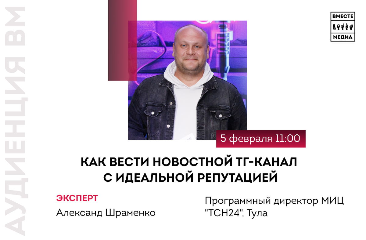 5 февраля в 11.00 по московскому времени пройдёт Аудиенция с одним из победителей первой волны конкурса «Вместе Медиа», программным директором МИЦ «ТСН 24» Александром Шраменко. Поговорим об особенностях ведения локального Telegram-канала новостного СМИ, обсудим следующие вопросы: ◻️ Как информационному каналу успевать за новостной повесткой? ◻️ Какой контент оставлять, какой - убирать? ◻️ Как рекламировать себя? ◻️ Как избежать накруток? Ждём вас для обсуждения всех интересующих вопросов. Регистрация Вместе Медиа