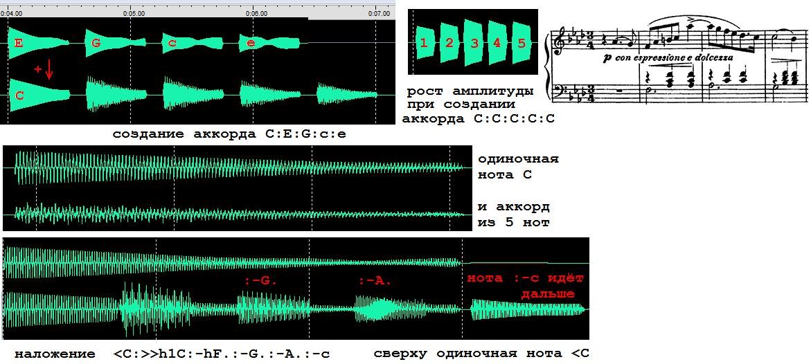 На иллюстрации показано, как программа создаёт аккорд из пяти нот – сначала в буфер записывается нота До, при этом записываемые семплы считаются и счётчик буфера увеличивает своё значение, по окончании синтеза семплов программа вернётся к чтению строки, найдёт там значок двоеточия и поймёт, что ожидается нота аккорда, по получении этой ноты она сдвинет счётчик на место начала предыдущей ноты (вы помните? это первое число на информационной строке), и начнёт семплы ноты записывать не в продолжение записи, а присоединять к семплам предыдущей ноты. Так, как это показано на иллюстрации. Точно так же присоединятся семплы и следующих нот аккорда.