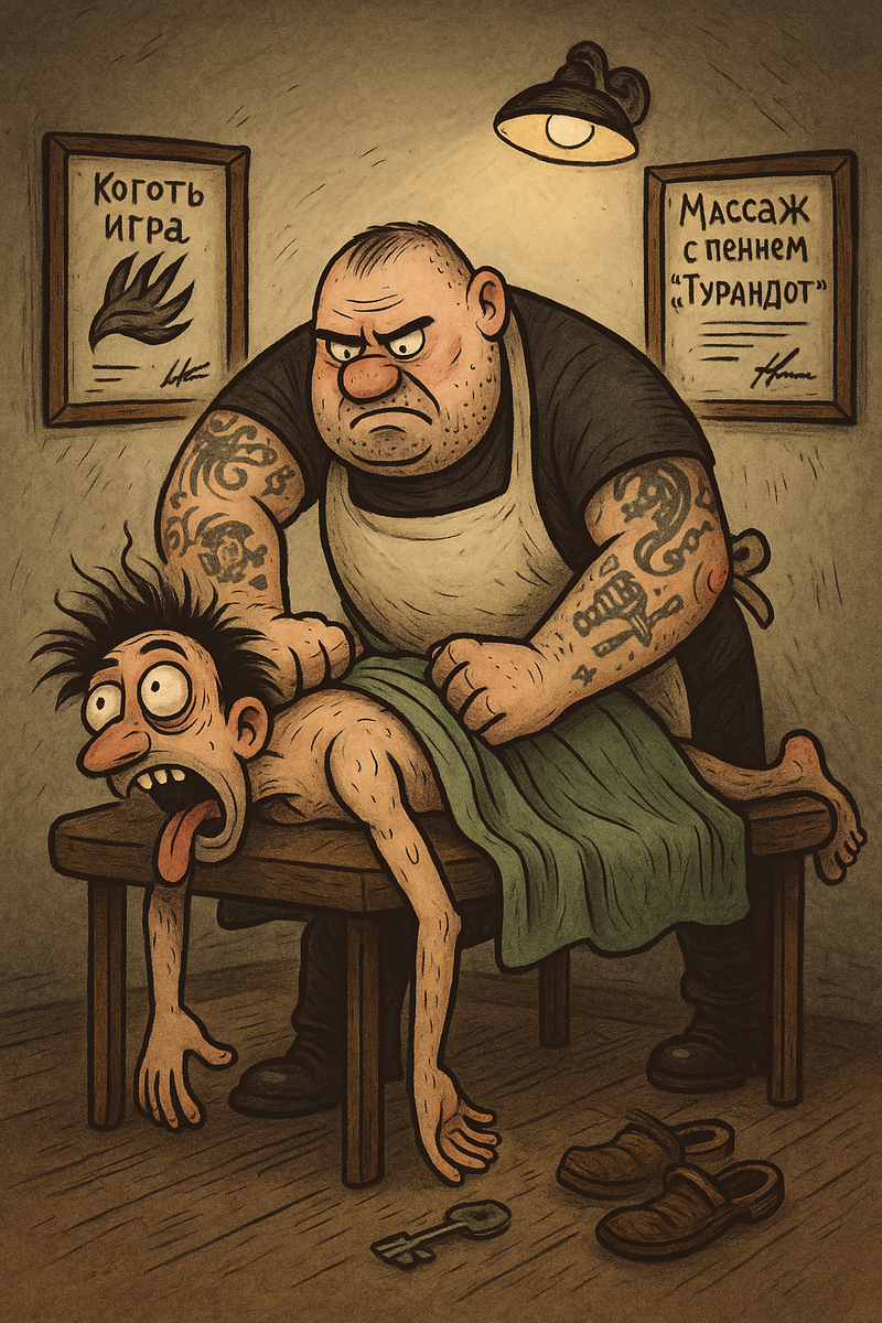Жека двигается вдоль позвоночника в сторону перепуганной поясницы. Продолжая незамысловатую игру пальцами на гуслях моей спины он неожиданно нажимает своим исполинским локтем на мою ягодицу и продавливает ее насквозь. Наступает момент, когда я готов переписать свою квартирую на Жеку.