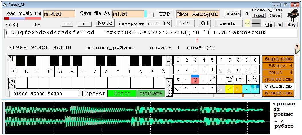 Кириллица в программе «Пианола_М» используется исключительно для замечаний, и это удобно, вводится она в текстовом режиме. Текстовый режим можно использовать и для вставок, перенося содержимое строк из одного места в другое.