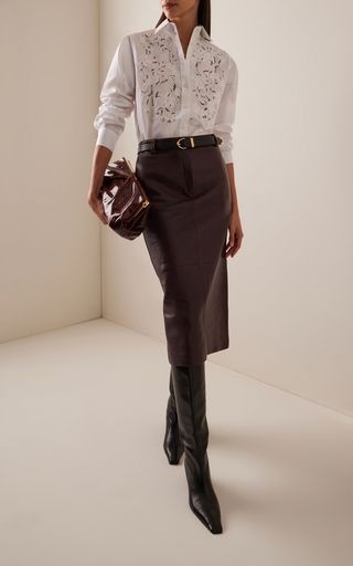 Пятница! Я даже не заметила как эта неделя подошла к выходным, так как вся в работе. Придумываю новые платья и этот процесс очень затягивает, а ещё и плохо спится, так как мозг работает и работает. Но сегодня же пятничный разбор и к нему у меня был выбран вот такой образ: Очень и очень красиво, стильно. Сапоги только бы другие, уж слишком увеличивают они размер ноги. Но сапоги меня в разборе меньше всего интересуют, а вот такая блуза даже очень! Если вспомнить обзоры коллекций, то вы уже заметили, что такая вышивка в изделиях , как на блузе, встречается всё чаще и чаще. И да, изделия с такой вышивкой смотрятся очень красиво, нарядно, даже не смотря на то, что такие изделия как правило самого простого кроя. И сегодняшняя блуза не исключение, так как она имеет стандартный крой рубашки и поэтому её можно назвать скорее рубашкой: Но мне больше нравится название блуза, так как более женственно звучит это определение . Кстати, это блуза от бренда Lafayette148. С этим брендом