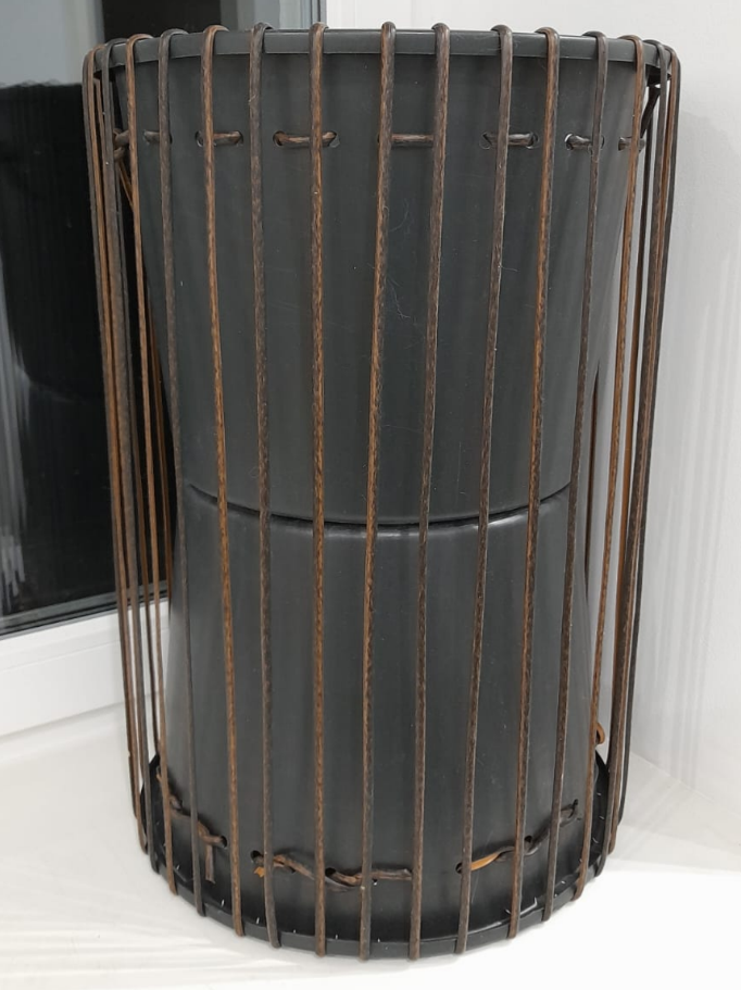Первым делом нужно установить стойки. А для этого сделать замеры и рассчитать длину лент на стойки. Отверстий в моем цилиндре 38, шаг между отверстиями - 2.5 см, а высота одной стойки = 67 см. Подставляем в формулу значения и получаем, что на стойки мне нужно 26 метров 41 см (67+2.5 х 38 = 26.41) . Это без хвостов. Плести такой длинной лентой неудобно, поэтому есть смысл разрезать ее на 4 части и тогда получится, что такими отрезками можно будет оплетать по 9.5 стоек. Но так дело не пойдет, мне нужно целое число, поэтому три отрезка у меня пойдет на 10 стоек и один на 8. Соответственно, мне понадобится три отрезка по 6.95 (69.5 х 10 = 6.95 м) и один отрезок 5.56 см (69.5 х 8 = 5.56). Добавим к каждому по 25 см на хвосты, округлим до целого и в итоге получается три отрезка по 7.2 м и один отрезок 5.8 м. С какой стороны заводить ленту, в данном случае не имеет значение - верх и низ у цилиндра одинаковый. Самое главное - натянуть стойки так туго, чтобы они были как струна. При натяжен