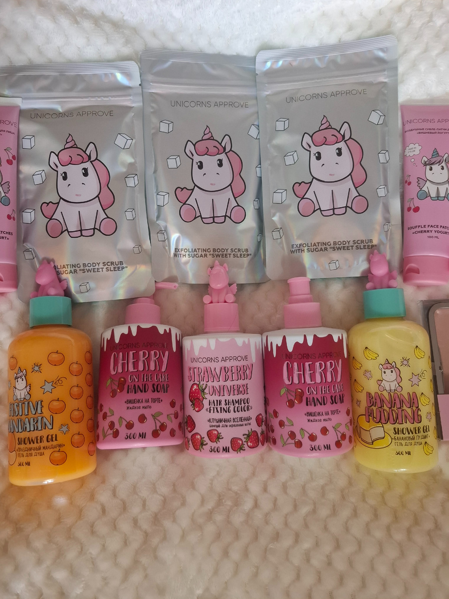 Пару лет назад я делала небольшие запасы уходовой косметики, чтобы, когда закончится какое-то любимое средство, например, гель для душа, не бежать в магазин в поисках более-мене нормального бренда и не ждать неделю пока доставят онлайн-заказ из Москвы с проверенной, качественной продукцией. После ухода известных брендов пришлось выбирать уходовые средства из тех, что есть в наличии. Декоративную косметику привычных, любимых брендов я приобретала во время путешествий заграницу, в основном, в Турции и ОАЭ. Будучи в России, я оформляла заказы онлайн в "Золотом Яблоке", "Летуаль" и иногда в "Рив Гош". Перечислю бренды, которые заказывала чаще всего, так как они отличались хорошим качеством продукции и стильной упаковкой. 1. Первый бренд, который подкупил меня прикольным дизайном и различными средствами с эффектом мерцающей кожи-это Unicorns Approve. Их шампунь для окрашенных волос помню, что приобрела, но так и не воспользовалась, так как очень щепитильно подхожу к выбору шампуня, а это