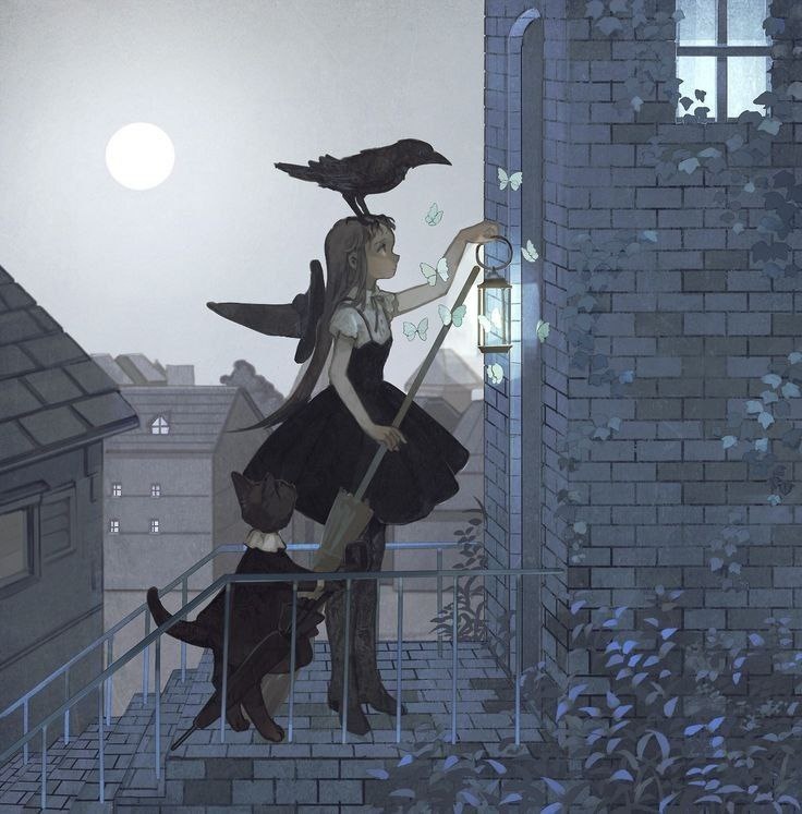 Стоит отметить, что девушка напротив выглядела не менее странно - в чулках разного цвета, в коротком кружевном синем платье, огромнейшей коричневой «ведьмовской" шляпе, которая каким-то чудом не сваливалась на лицо, и с метлой под мышкой. Через плечо наискось была перекинута холщевая сумка с вышитыми на ней замысловатыми узорами.