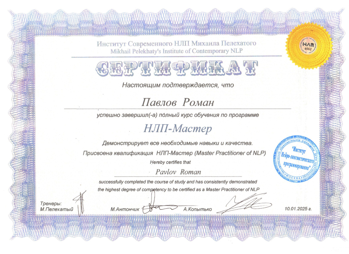С 03-10 января 2025 прошел повышение квалификации по программе "Интенсивный курс НЛП-МАСТЕР". Объём: 80 академических часов. Ведущий - Михаил Михайлович Пелехатый. Институт Современного НЛП Михаила Пелехатого.