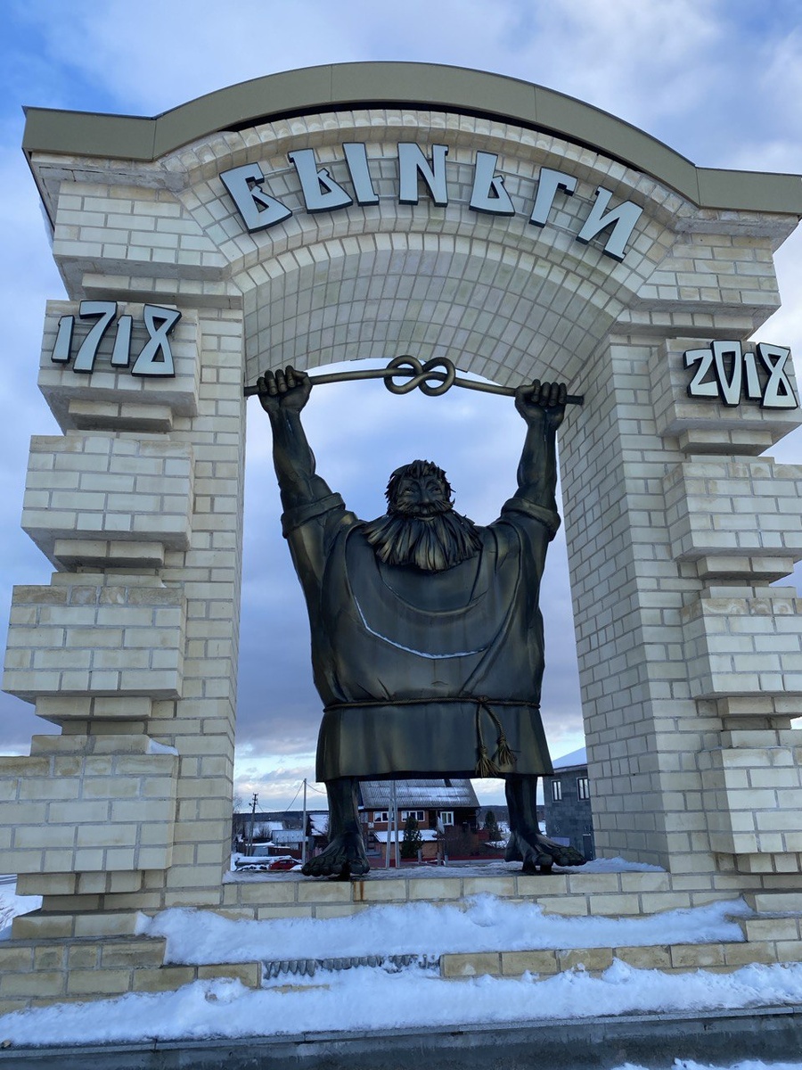 Что вы представляете под названием "городская стела"? Обычно это что-то связанное непосредственно с городом, и, как правило, что-то скромное и скучноватое. Я вас сейчас познакомлю с самой необычной стелой, которую встречала. Она не только поражает своей оригинальностью, но и вызывает смех. Я родом из большого города Свердловской области — Екатеринбурга. Буквально недавно, в связи с работой, я разъезжала по соседним городам и населённым пунктам. Эти мегаполисы настолько приелись в моих глазах, что даже слов нет, но то, что я увидела в селе Быньги, до сих пор вызывает у меня улыбку до ушей. Это село находится в Невьянском районе Свердловской области. Заезжая в населённый пункт, можно заметить силуэтного и сурового уральского кузнеца или металлурга, в руках которого находится железный прут, а надпись гласит: «Быньги 1718–2018». «Ну, симпатичный мужичок», — подумала я и проехала дальше. В следующий раз, когда мне посчастливилось приехать в село, я уже не удержалась и решила остановиться, в