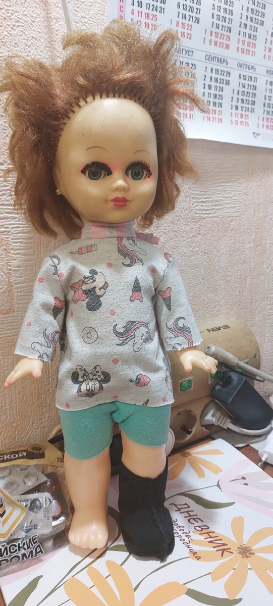 Всем добрый вечер! Видите на кукле сапожок? Это я сама сшила. Из старого куска замши. Она мягкая и я ее сшивала обычной иголкой и даже без напёрстка. Кукла старая, но мы ее приукрасим, приоденем и она еще послужит нормальной моделью для наших мелко-портняжных дел=тренировок по обыкновенному шитью. Но вот выкройку кукольного сапога я сделала сама. Сначала из бумаги, но она рвалась. Потом из куска ткани. И тоже не получилось. Но потом я все же пришла к удачному результату. А вот второй сапог по выкройке мы сделаем уже вместе с внучкой, чтобы и разложить можно было выкройку, вырезать ее и чтобы она увидела как и что там нужно соединять, чтобы получилось изделие. Должна сказать, что футболку и шортики для этой старой куклы я тоже сшила вчера. Без выкройки. Просто прикладывая ткань к модели и подрезала где нужно. А вот сегодня мне в ленте выскочили видео платьев куклы КАТАЛОНКИ. Не открывала само видео, но даже первые кадры рекламы интересные. Мне много нарядов не нужно, но если что-то бу