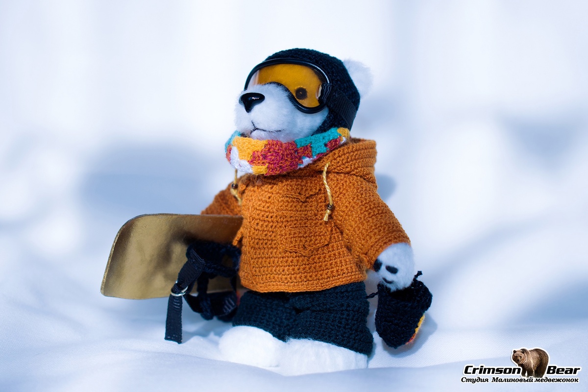 Размер 10 см. Подвижная голова на шплинте и лапы на проволочном каркасе. Шлем, очки, шарф, варежки и сноуборд снимаются. Кармашки на куртке функциональны, можно положить туда записку с поздравлением или пожеланием.