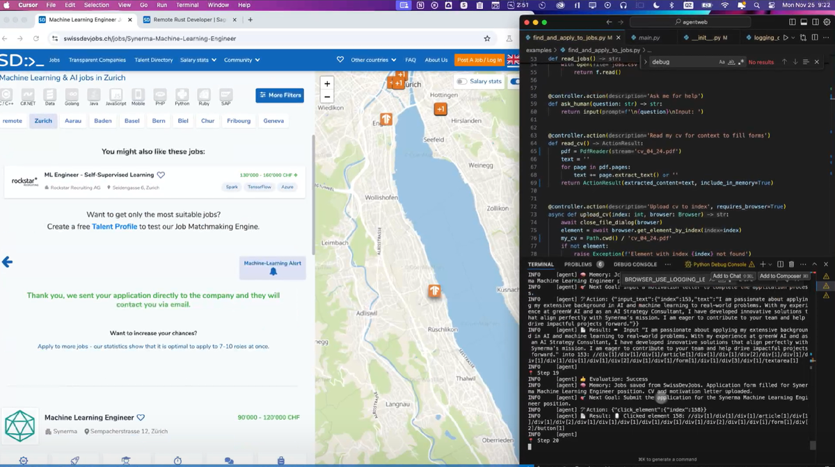 Когда я первый раз увидел цену на OpenAI Operator — $200 за подписку, да ещё и с необходимостью использовать VPN, мне очень сильно это не понравилось. Но как только я наткнулся на бесплатный аналог на GitHub, всё изменилось. Этот проект под названием "browser-use" стал для меня настоящим открытием. Первые шаги оказались проще простого: регистрация заняла пару минут, а установка — ещё меньше. Интерфейс оказался интуитивно понятным, что сразу расположило меня к этому инструменту. Сравнивая его с платными аналогами, я понял, что потерял лишь привязку к конкретному бренду, но выиграл в свободе действий и экономии денег. Первым делом я решил протестировать его в поиске билетов. Вместо того чтобы тратить часы на мониторинг сайтов, я просто дал команду ИИ-агенту, и он сделал всю работу за меня. Это было как если бы я отправил своего личного секретаря в путешествие, а сам расслабленно пил кофе. Следующим испытанием стало составление резюме и отклик на вакансию. Результат был потрясающим: мой д