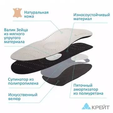 Обращайте внимание на материал изделия. Он должен выполнять поставленные задачи. В значительной части стелек «Крейт» используется натуральная кожа. Зимние стельки производятся с использованием материалов, обеспечивающих максимально комфортный микроклимат. Спортивные — с применением противоскользящих воздухопроницаемых поверхностей.