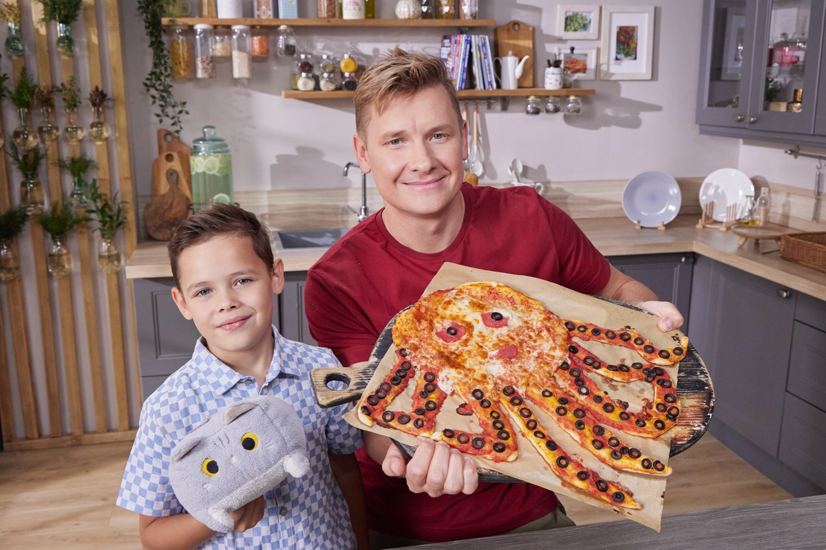 Рецепт пиццы «Осьминог» Ингредиенты: Тесто слоеное бездрожжевое 400 г Мука 30 г Томаты в с/с очищенные 200 г Базилик сушёный 1 ч. ложки Оливки без косточек 50 г Моцарелла для пиццы 40 г Салями колбаса в нарезке 2,5 слайса Соль по вкусу Приготовление: 1. Заранее разморозить тесто, насыпать на стол 30 г муки на подпыл и раскатать один пласт в более тонкий и разрезать на 8 одинаковых полосок 2. Обрезать уголками края каждой полоски 3. Раскатать второй пласт и отрезать края, чтобы получился круг — голова осьминога. 4. Застелить противень пергаментом, переложить «голову» осьминога и прикрепить полоски к телу. 5. Переложить в куттер помидоры в собственном соку, посолить и поперчить по вкусу, добавить 1 ч. ложку сушёного базилика и перебить до однородности. 6. Нарезать оливки колечками. 7. Смазать голову и щупальца томатной массой. 8. Натереть на крупной тёрке сыр и посыпать голову. 9. Глаза — 2 слайса колбасы, а зрачки - колечки оливок, половина колбасы — рот. 10. Колечками из