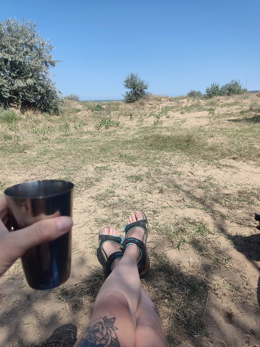 Программа «Все выключено» накормила нас вкусной гречкой с сосисками, на завтрак, и чаем без сахара. В соседних лагерях стали просыпались люди, кричали от радости, дорвавшиеся до игрушек, дети… Но кого вообще волнуют эти «пятизвездочные неудобства», когда сидишь в тенистом оазисе посреди белых песков на берегу утреннего, пока еще кристально прозрачного и спокойного Каспийского моря?