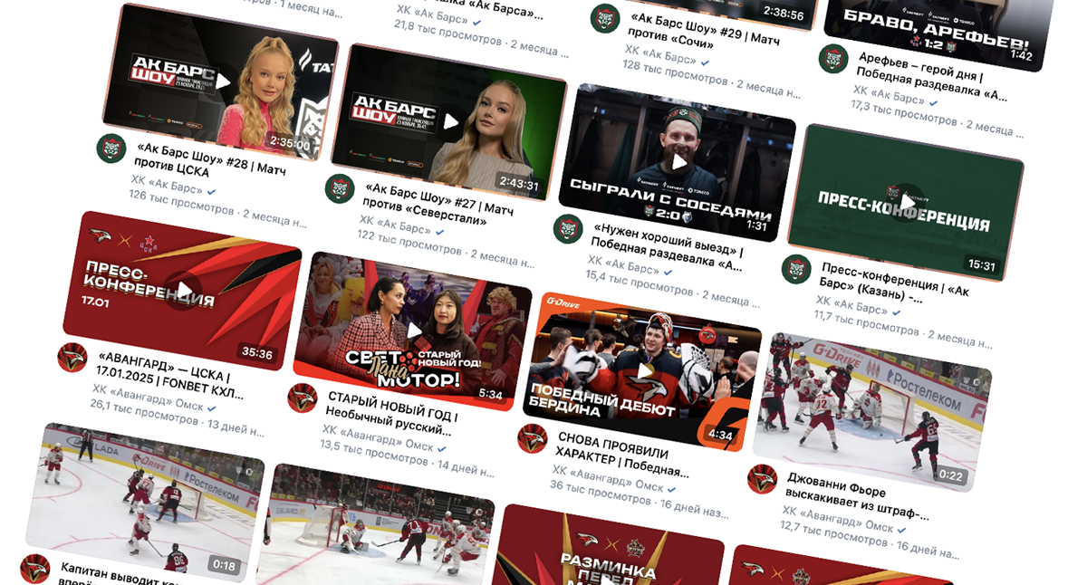 Видео − самый охватный формат в соцсетях спортивных клубов. Афиши, фотографии с матчей и статистика никогда не дадут просмотров на уровне рилсов и шортсов. При этом у большинства команд КХЛ не все гладко в этом направлении. «Коммерческая пауза» подготовила обзор, который поможет в создании и продвижении видео-контента. В этом нам посодействовали представители медийки «Авангарда» и «Ак Барса» – одни из лидеров этого направления в лиге.Платформы: проблема YouTube, интеграция VK Видео
