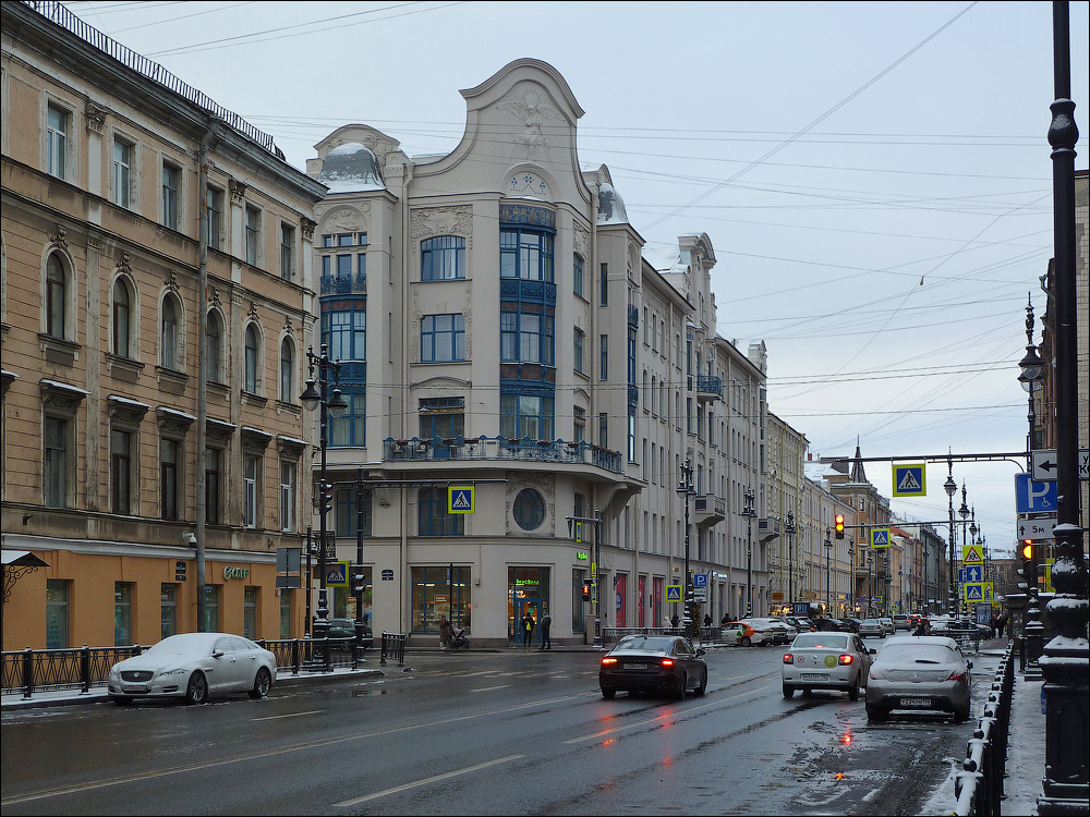 На углу проспекта Чернышевского с нашей улицей Захарьевской мы полюбовались ещё одним весьма симпатичным домом в стиле модерн. Как нам подсказали позже — это бывший доходный дом Н.М.Нельговской, построенный в 1910-1911 годах по проекту архитектора С.А.Баранкеева.
