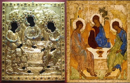 ««Троица» (известная также как «Гостеприимство Авраама» – ВП) – икона Святой Троицы, написанная Андреем Рублёвым в первой трети XV века. Самое знаменитое из его произведений и одна из двух (вместе с фресками Владимирского Успенского собора) сохранившихся работ, которые, как считают учёные, достоверно принадлежат ему. Является одной из самых прославленных русских икон. Документальных свидетельств об авторстве и истории создания «Троицы» не сохранилось».