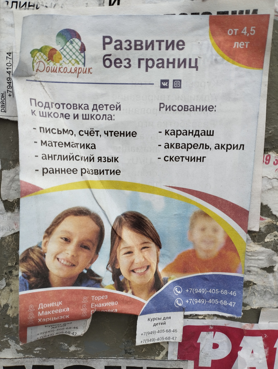 Знаете, что меня удивляет сейчас в Донецке? Большое количество всяких центров для развития детей, которые в городе появляются, как грибы после дождя. Вот свежие объявления на доске. Для детей предлагают изучение английского языка, занятия рисованием и неким скетчингом. Кстати, знаете, что это такое? Оказывается, быстрый рисунок от руки. Ну, типа набросок. А ещё для детворы компьютерные курсы. Это очень актуально. Еще покажу, как выглядит сейчас большой детский развивающий центр на проспекте Ильича в центре города. Ну, вы поняли... К чему это я? Не только у тому, что всё лучшее - детям, а ещё к тому, что сегодня дети для России особенно необходимы. И чем больше их будет, тем лучше для огромной страны. Значит, нужно хранить каждого ребёнка. Даже ещё до его рождения. Теперь напомню, о чем ранее шла речь вот в этой статье на моём канале: Читатели, обсуждая проблему семьи из Большой Новосёлки, сознательно отказавшейся от запланированного третьего ребёнка, почему-то ни разу не вспомнили о п