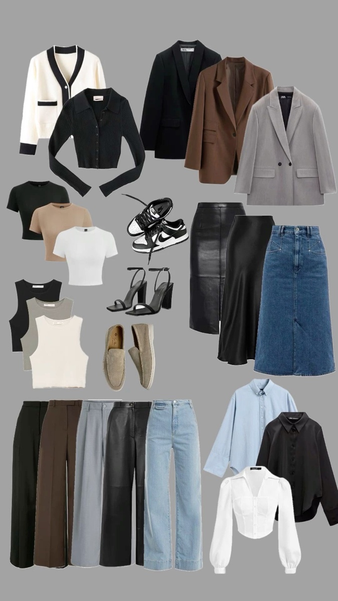 Базовые вещи – это основа, которая помогает комбинировать одежду. Это могут быть белая футболка, классические джинсы, чёрные брюки или юбка-карандаш, лаконичный жакет, Удобная обувь (кроссовки, балетки, ботильоны).
